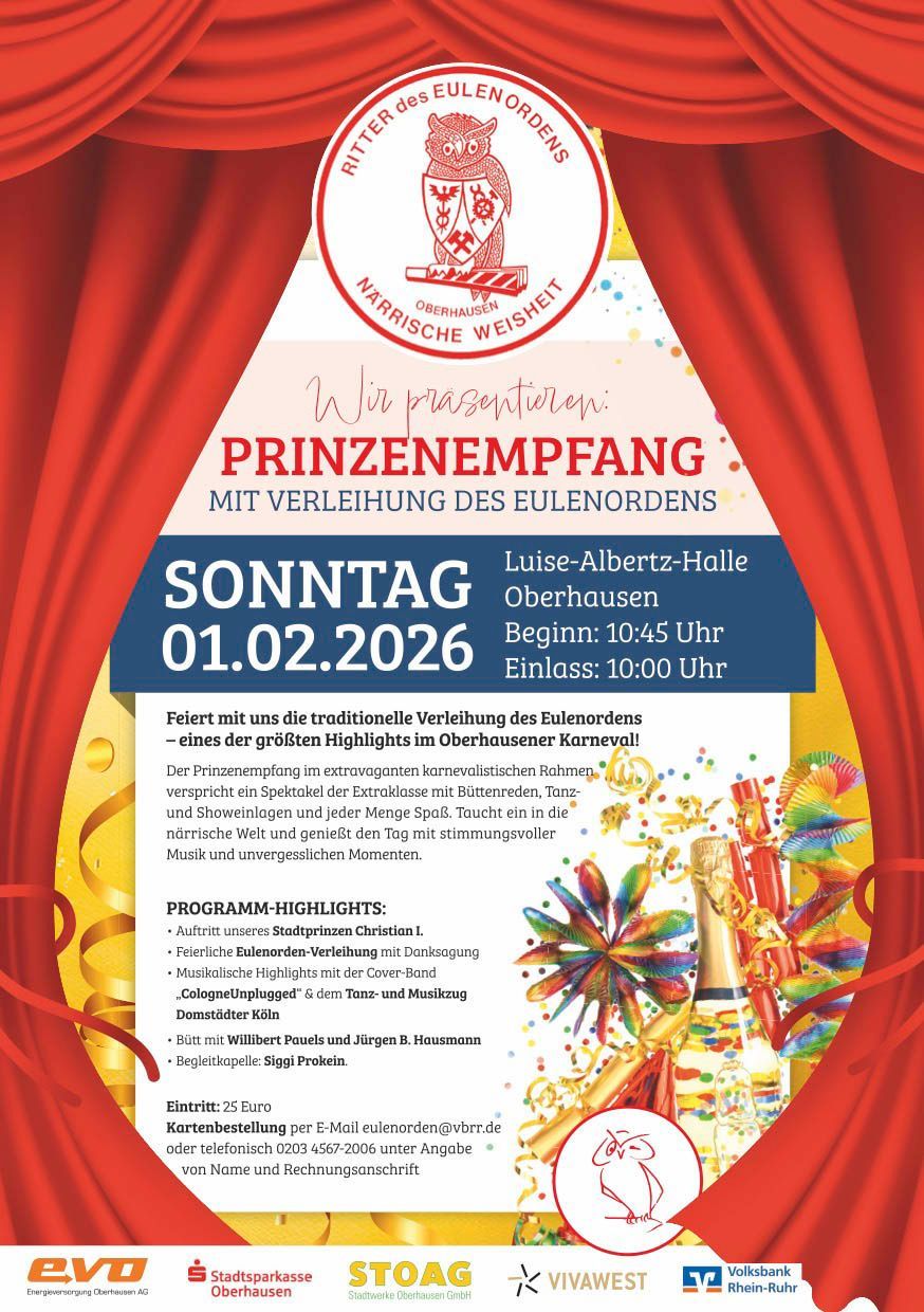 Der neue Präsident des Eulenordens, Oliver Reuter, begrüßte die Vertreter der Oberhausener Karnevalsgesellschaften, seine Tollität Stadtprinz Christian I. samt Garde und Gefolge, das Kinder-Prinzenpaar Prinz Diego und Prinzessin Mila sowie das neue Dreigestirn. Mit Charme und Souveränität führte er durch das abwechslungsreiche und stimmungsvolle Programm.