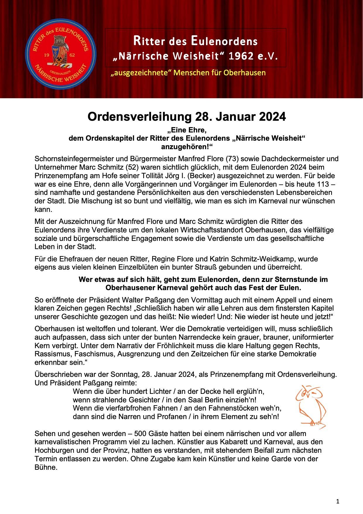 Die Ritter des Eulenordens trauern um Wolfgang Flesch, Mitglied der Ritter des Eulenordens „Närrische Weisheit". Er wurde 1982 als 38. Mitglied in den Orden aufgenommen und starb am 18. Juli 2024 im Alter von 88 Jahren.